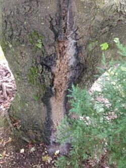 The client has a large oak tree that is losing sap. There is a bad odor and a hole at the base of the tree where sap is oozing. What is causing this and how should it be handled?