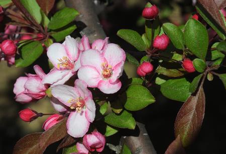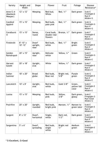 If you have your heart set on a flowering tree, consider the lowly crabapple. Many people react by saying, “Oh no! I don’t want all those apples all over my lawn or sidewalk and the darn yellowjackets!” I have a solution for that. Crabapples are also prone to scab and rust. I have a solution for that, too. Have you got your heart set on a weeping cherry? Well, there is even a solution to that. Consider a crabapple for its small size (‘Kwanzan’ cherries can reach 30’-40’ high and wide) and simply choose a scab, rust, fireblight or mildew resistant cultivar. Further, you get to choose your fruit size. Not all crabapples have large fruits. Many crabs have tiny fruit, the size of a berry. The birds usually strip fruit before they make a mess. You might not want to plant it right over a walkway where unripe fruit could blow out of the tree, making a mess. However, if it is in a lawn, any fallen fruit will disappear into the grass and quickly rot. Yellowjackets are usually not an issue. If you are a bird lover, mockingbirds, especially, love the ripe fruit. Below are some crabapple varieties you might want to consider if you want the look of a cherry, but the hardiness of a crab.