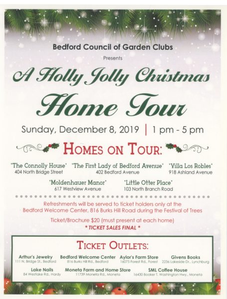 Tickets/brochures can be purchase from any of the garden club members and also Arthur’s Jewelry, The Bedford Welcome Center, Aylor’s Farm Store, Givens Books, Moneta Farm & Home Store, Lake Nails at Westlake, and SML Coffee House at Bridgewater.