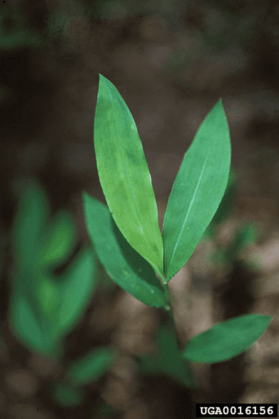 Stiltgrass has pale green, lance-shaped leaves that are between one to three inches long. The leaves alternate along an often droopy stem. Look for a silvery main vein running just off center of each leaf.