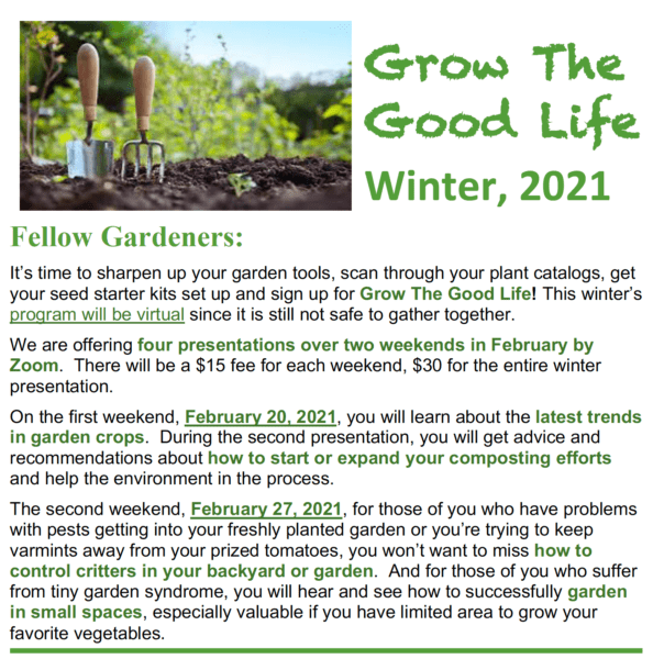 It’s time to sharpen up your garden tools, scan through your plant catalogs, get your seed starter kits set up and sign up for Grow The Good Life! This winter’s program will be virtual. The Bedford Extension Master Gardeners Association is offering four presentations over two weekends in February by Zoom. There will be a $15 fee for each weekend, $30 for the entire winter presentation. Open the Event Flyer below to read more about speaker bios, topics & event details.